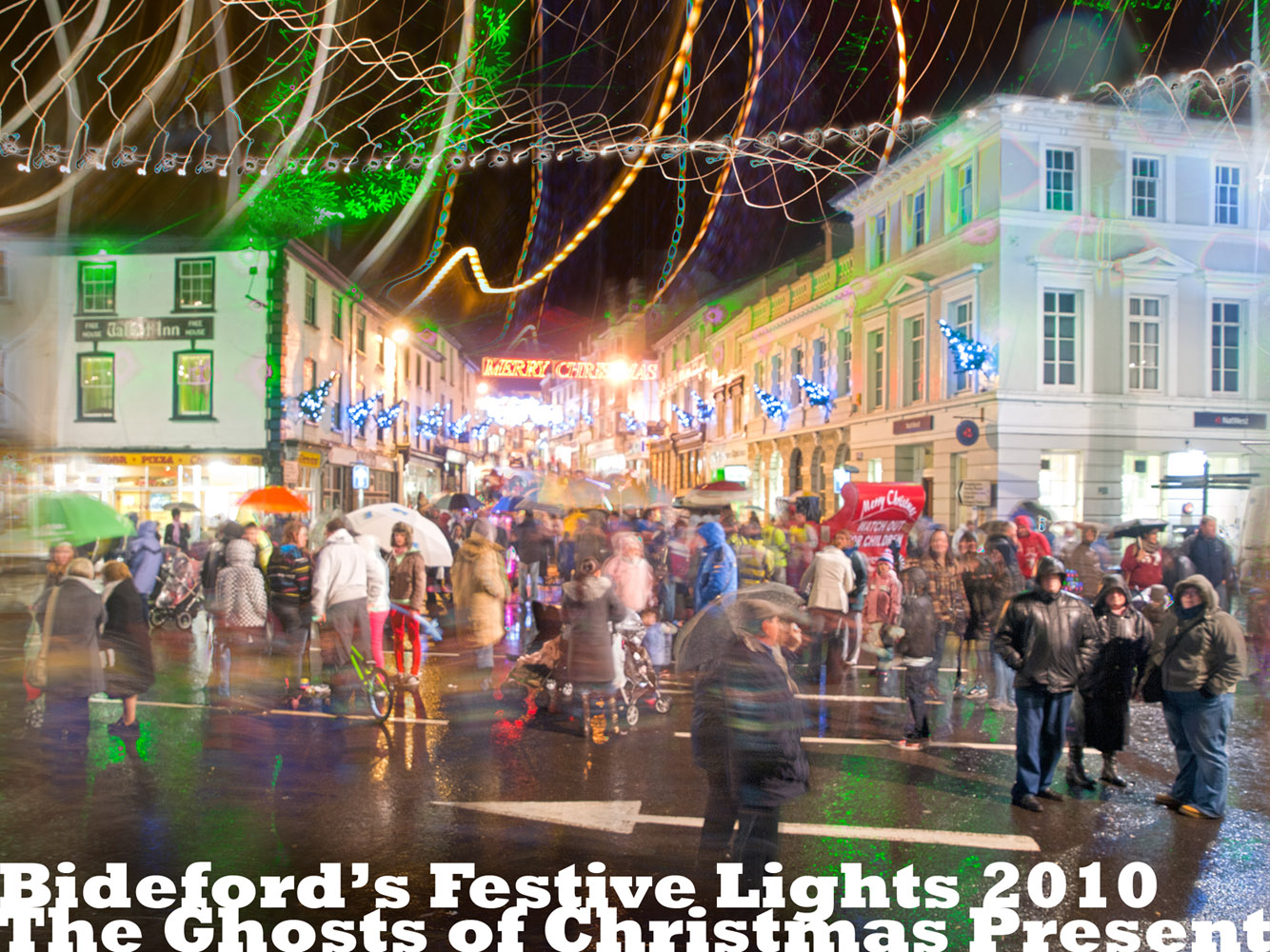 Therefore my New Year?s resolution is to make a post of my Christmas image for the record and so that anyone viewing this blog who hasn?t received a Seasonal Greeting from me may get one. This image, taken during the switching on of the Christmas lights in Bideford was an experiment with Photoshop CS5?s HDR capability. Rather than combining images with a range of exposure, I combined a variety of the same exposure but with different parts of a laser show, people in different places and all of this at a slow exposure which blurs a lot of the movement. It isn?t a straight HDR either because that combined image was then merged with a couple of others taken from the same place, and some of these were made through intentionally adding some movement to the camera mid-way through an exposure. I?m really pleased with the result because it makes a very disappointing display, from a spectator’s point of view standing in torrential rain, into a real light spectacular.